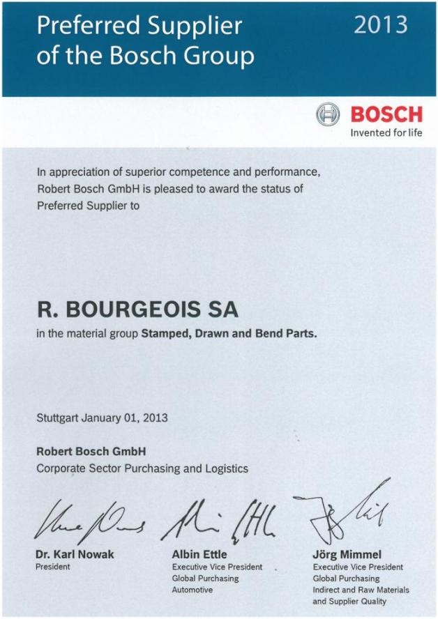 For consecutive 4 years,, R.Bourgeois won the award of « Preferred supplier of Bosch Group 2013. »